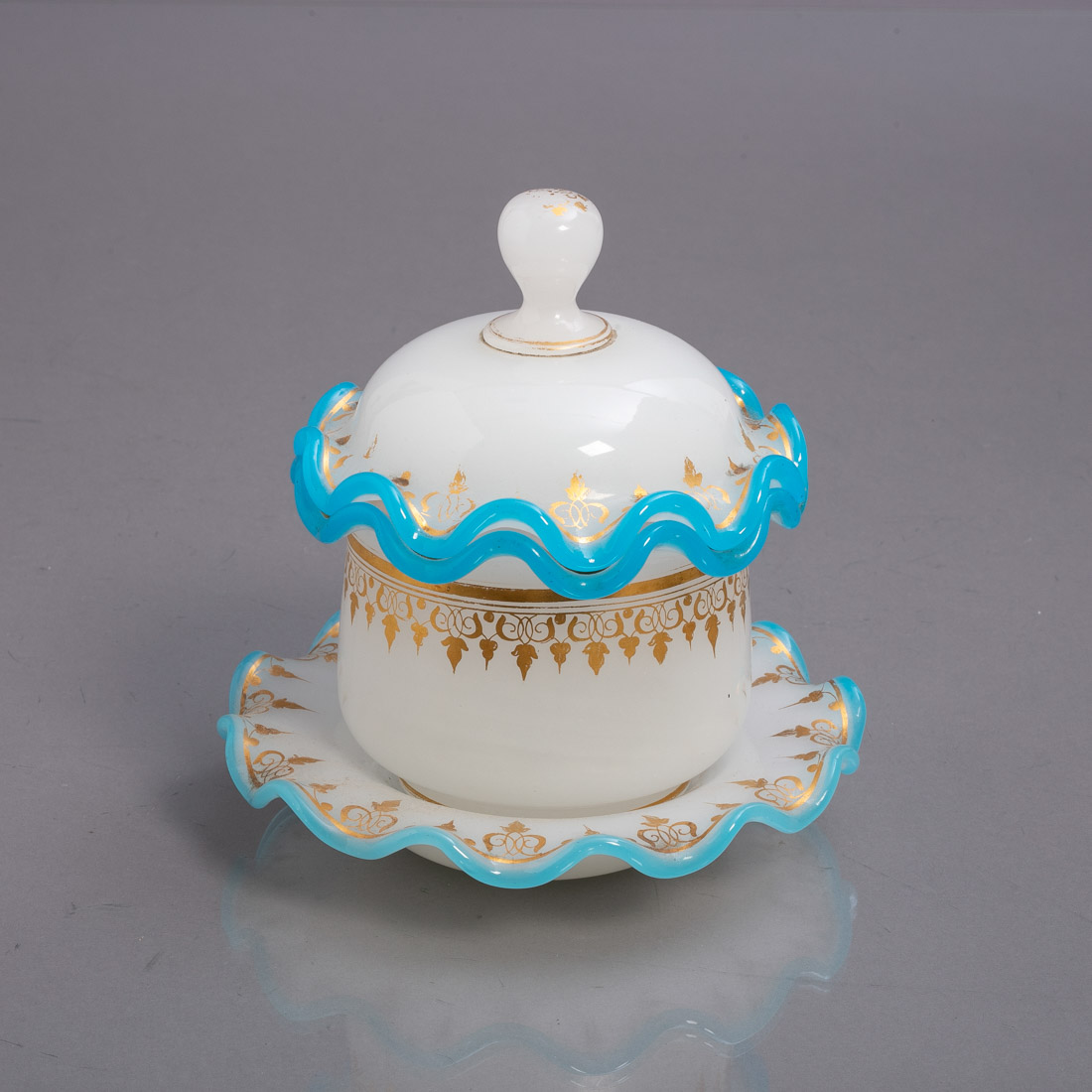 Em vidro bicolor decorado com dourados, bordos ondulados. Europa, Séc. XX. Sinais de uso.