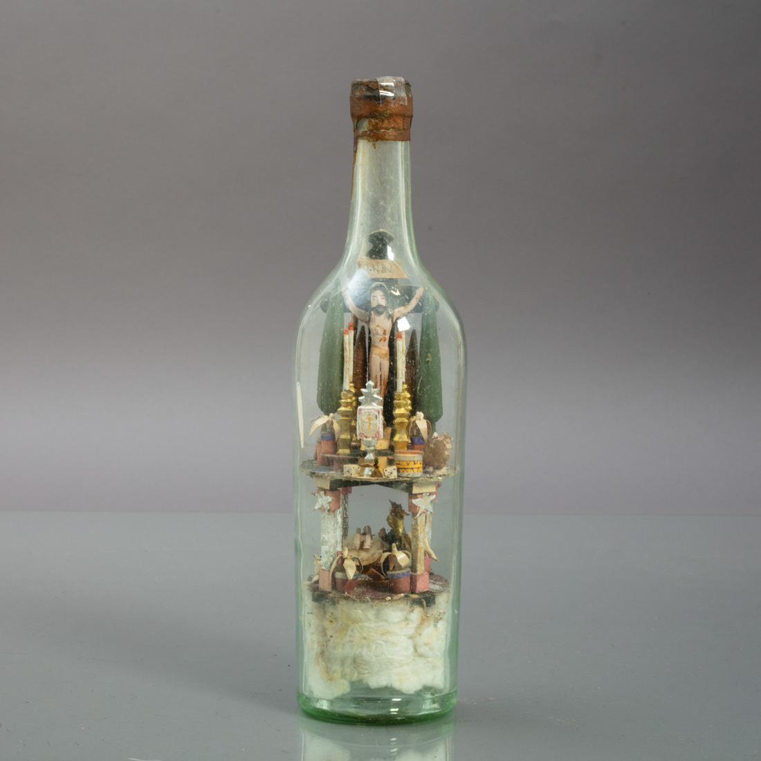 Em vidro, contendo no interior duas representações da vida de Cristo, em diferentes materiais. Séc. XIX/XX. Pequenos defeitos.