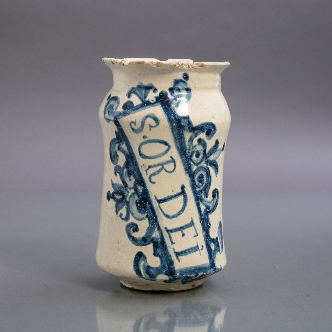 Em faiança portuguesa, decoração a azul com cartela barroca e inscrição. Séc. XVII. Falhas, cabelos e craquelé.
