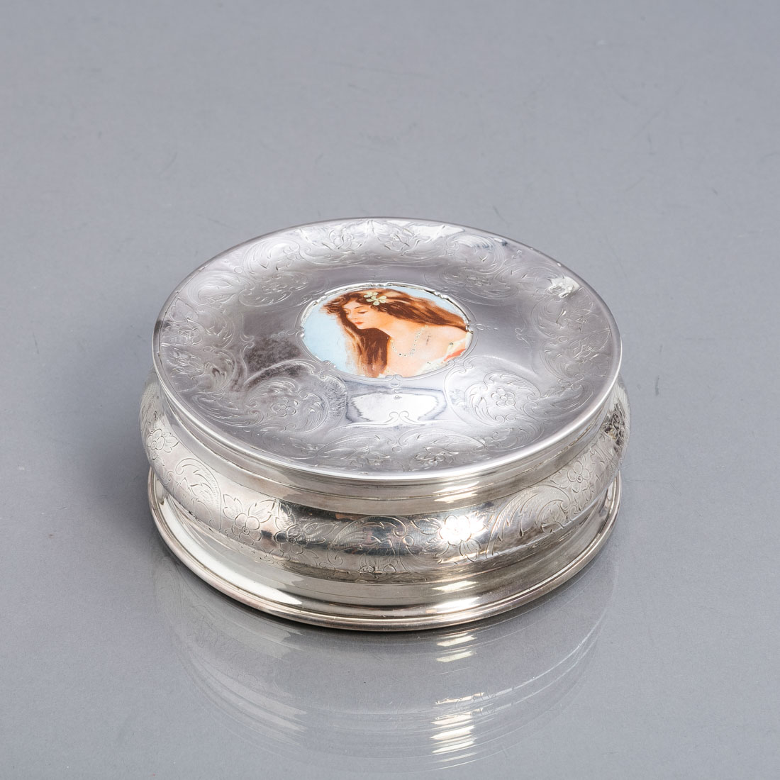 Em prata portuguesa contraste águia (1938-1984) de 833, decoração gravada "flores", na tampa esmalte policromo "figura feminina". Sinais de uso.