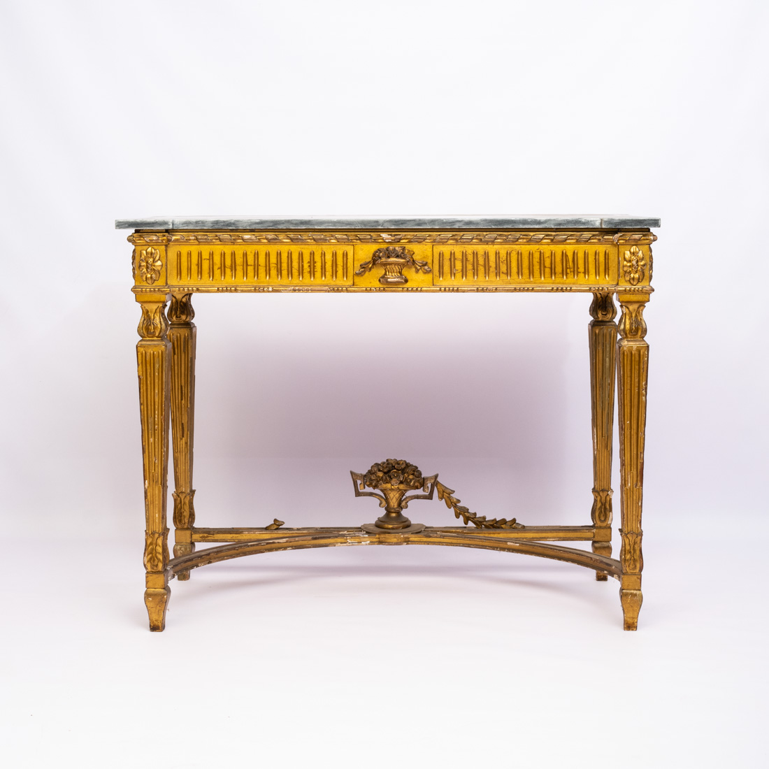 Estilo D. Maria, em madeira entalhada e dourada, tampo em mármore. Séc. XIX. Falhas e pequenos defeitos.