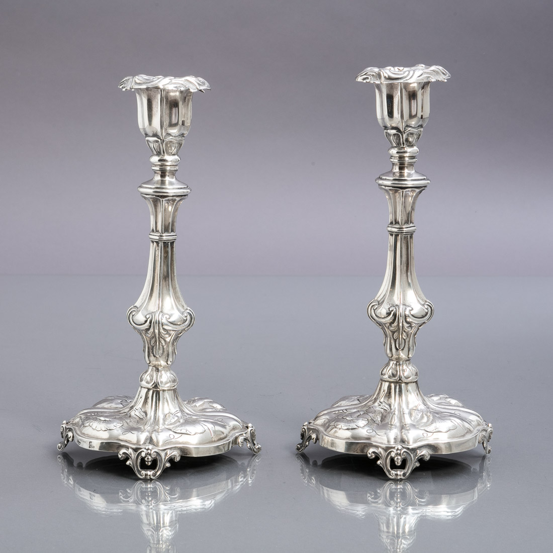 Em prata portuguesa do Séc. XIX, marca de ensaiador do Porto (P-61) José Rodrigues Teixeira e de ourives (P-191) Companhia Aurificia, decoração relevada "flores e folhagem", pés vazados. Sinais de uso, leves amolgadelas.