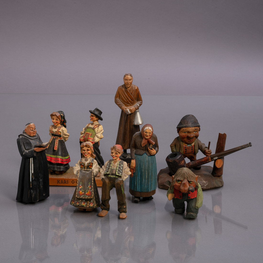 Nove esculturas em madeira pintada. Europa, Séc. XX. Sinais de uso, duas com falhas.