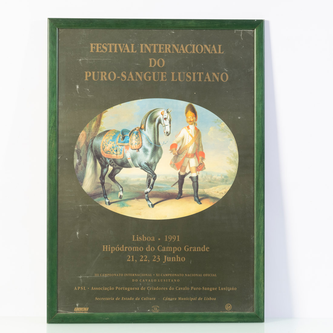 "Festival Internacional do Puro Sangue Lusitano" Hipódromo do Campo Grande, Lisboa 1991". Impressão colorida sobre papel. Emoldurado. Pequenos defeitos.