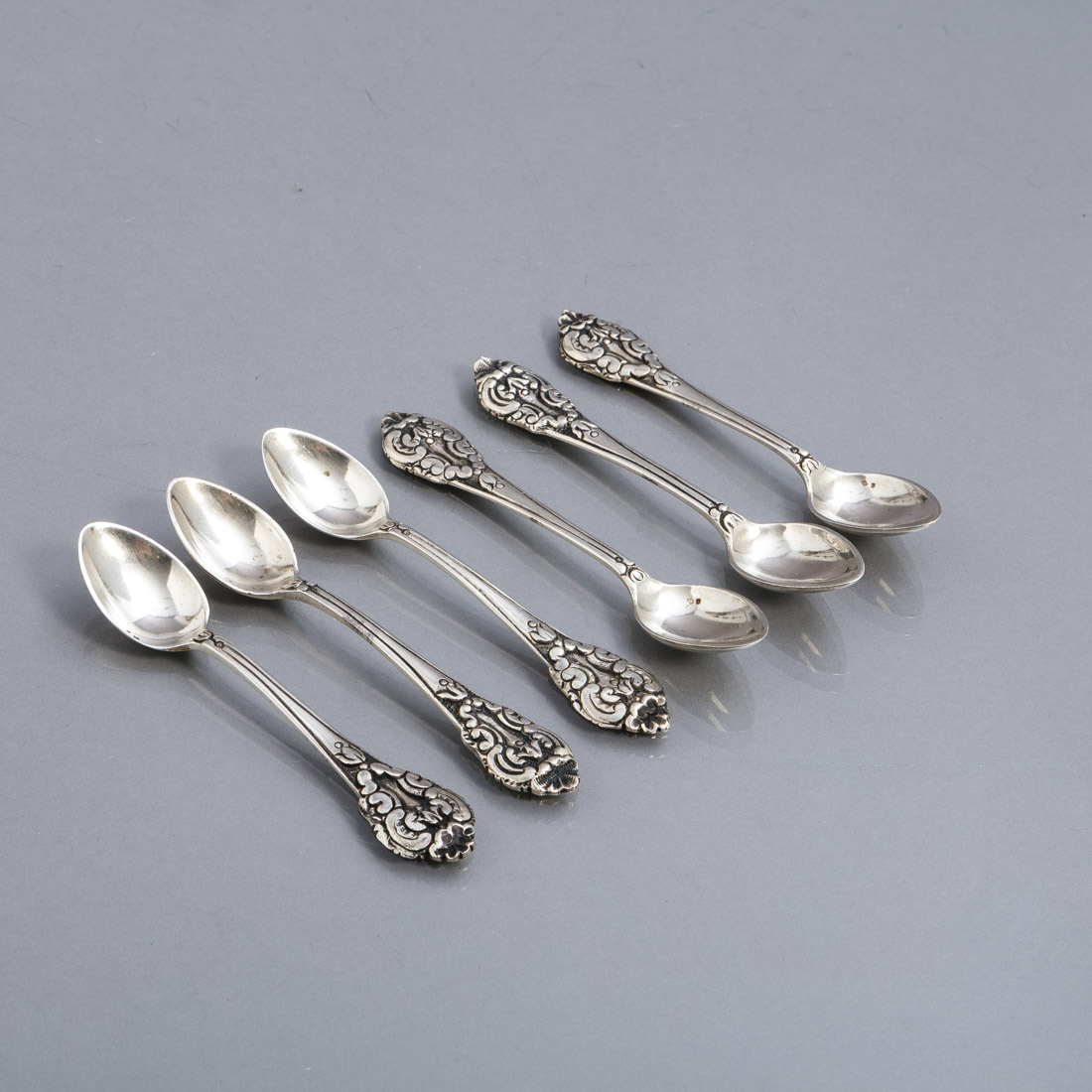 472. CONJUNTO DE SEIS COLHERES DE CAFÉ - Em prata portuguesa contraste águia PA 113 g