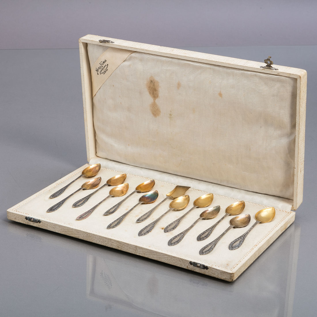 Em prata portuguesa contraste javali (1887-1937) e águia (1938-1984) de 833, decoração relevada "flores", parcialmente dourada. Em estojo. Sinais de uso.