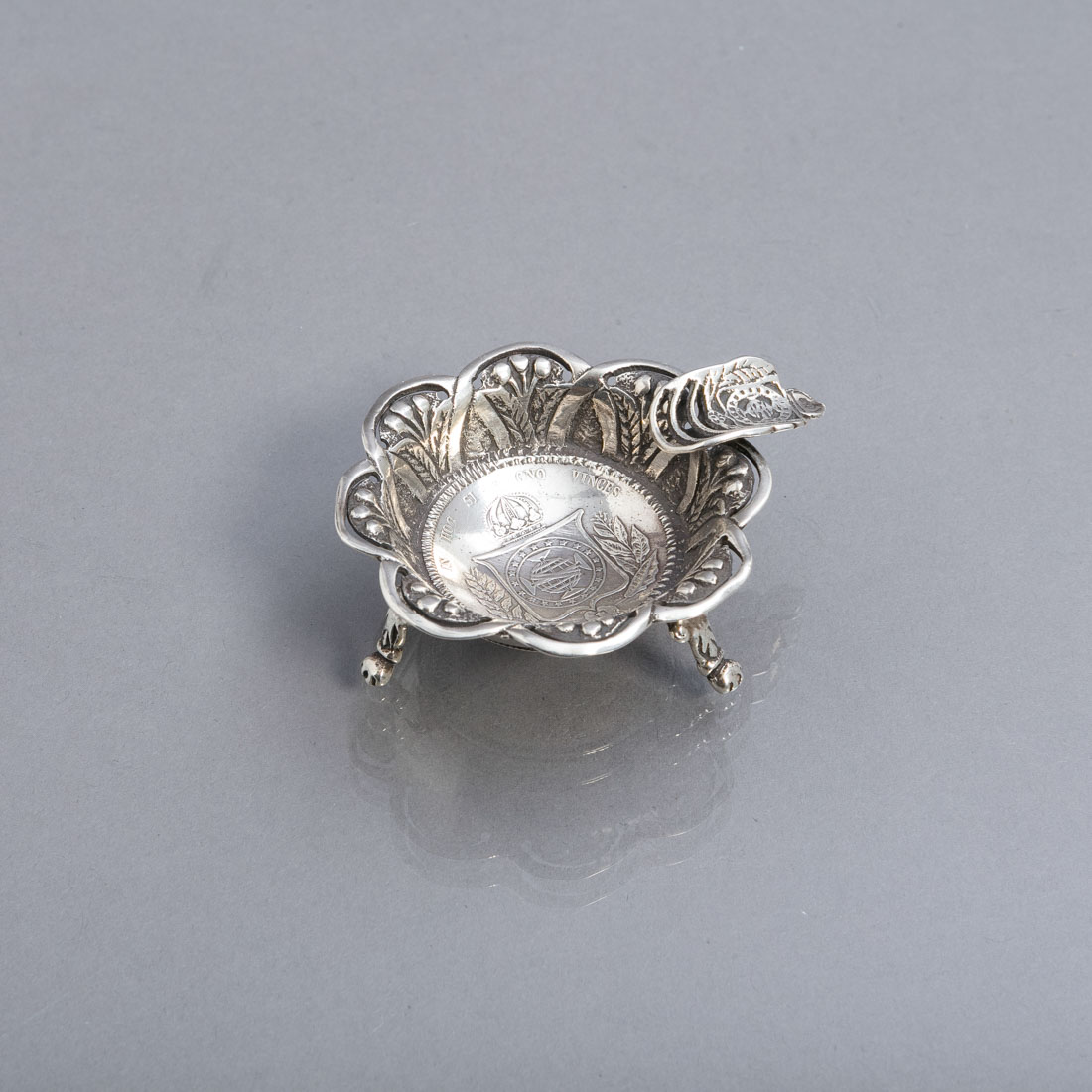 Em prata de 900, decoração relevada e vazada, fundo com moeda de 1000 reis datada de 1858. Sem marcas, ao abrigo do Decreto-Lei n.º 120/2017. Sinais de uso.