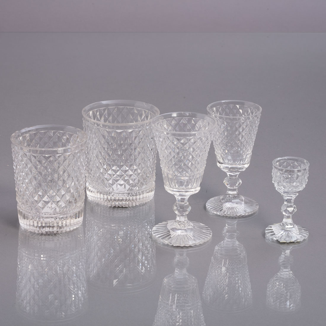 Em vidro moldado e relevado "ponta de diamante", três de pé, possivelmente da Vista Alegre. Esbeiçadelas.