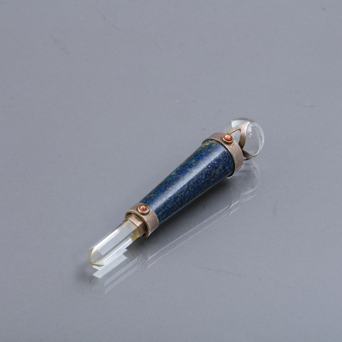 Em lápis-lazúli, quartzo e prata com dois cabochons. Sem marcas, ao abrigo do Decreto-Lei n.º 120/2017. Sinais de uso, pequena falha.