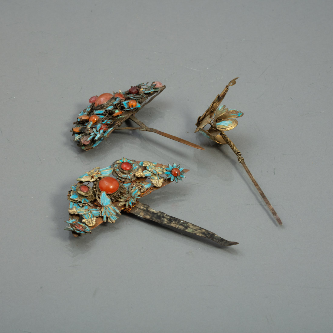 497. TRÊS ADORNOS DE CABELO DIVERSOS CHINESES