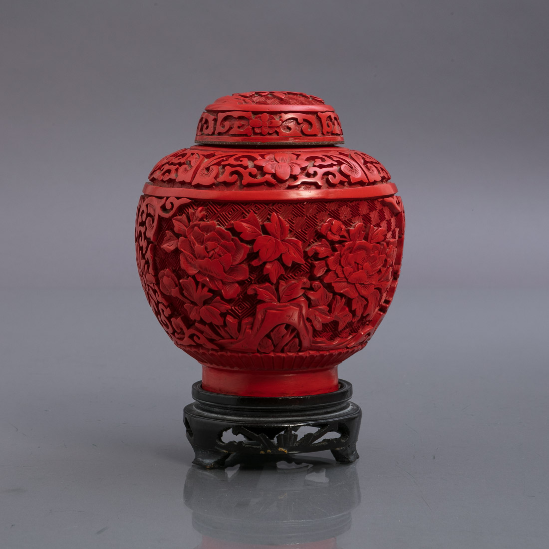 Em metal revestido a laca cinnabar vermelha, decoração relevada "flores". Base em madeira entalhada. China, Séc. XX. Sinais de uso.
