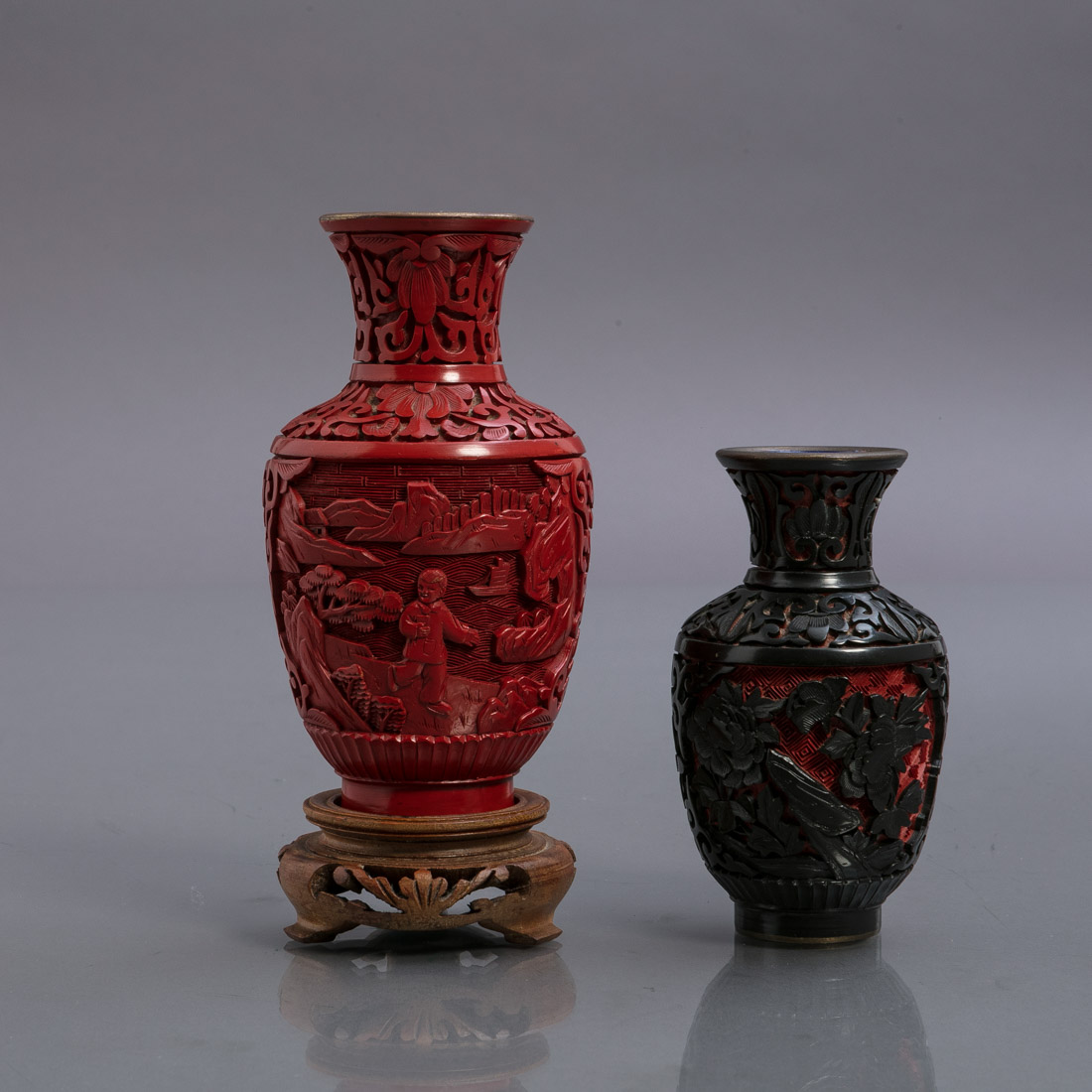 Em metal revestido a laca cinnabar, decoração relevada, uma a vermelho "paisagem fluvial", outra a negro "flores". Uma com peanha em madeira entalhada. China, Séc. XX. Sinais de uso.