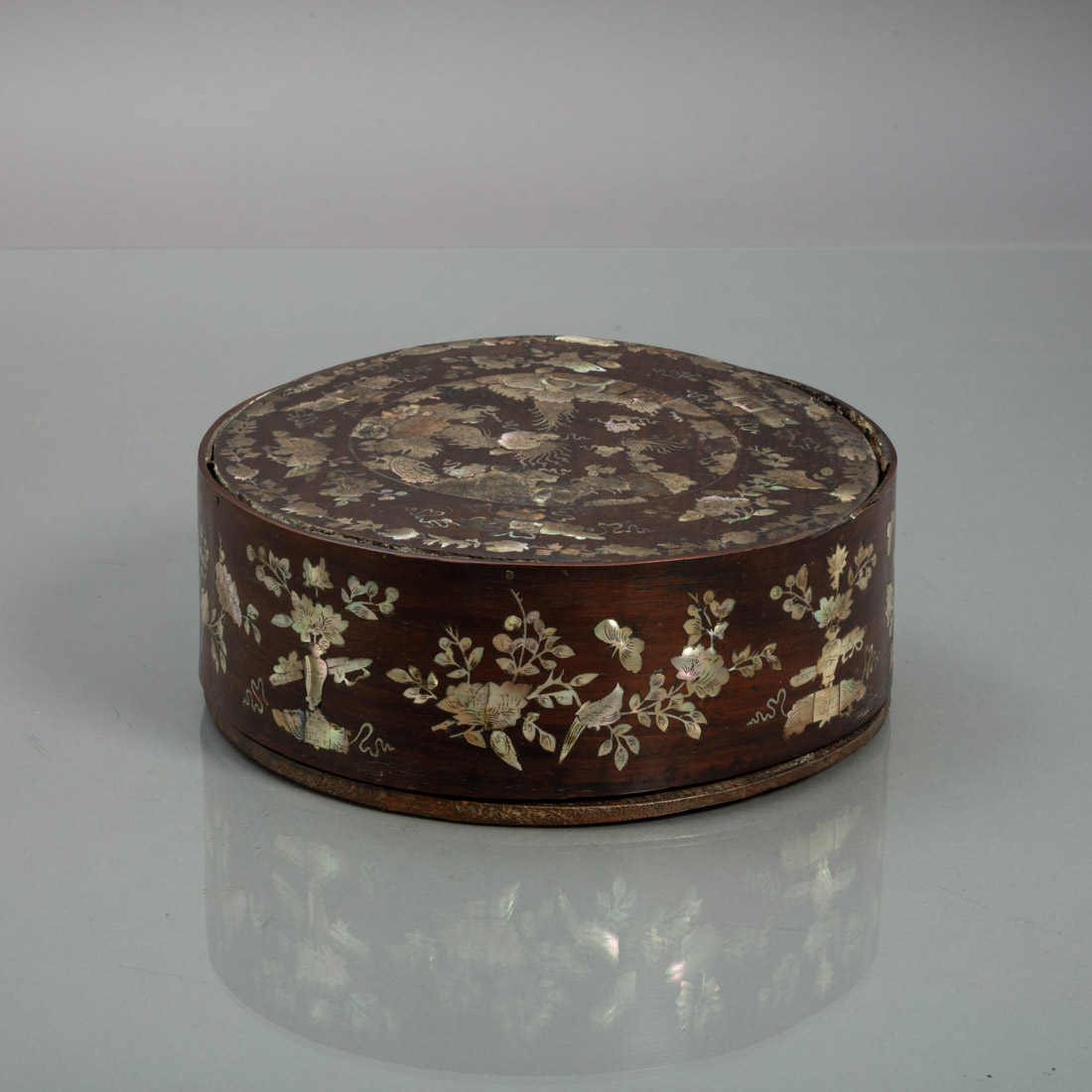 Em madeira exótica com incrustações em madrepérola, decoração "flores, objectos e dragões". Sino-portuguesa. Séc. XVIII/XIX. Falhas, faltas e defeitos.
