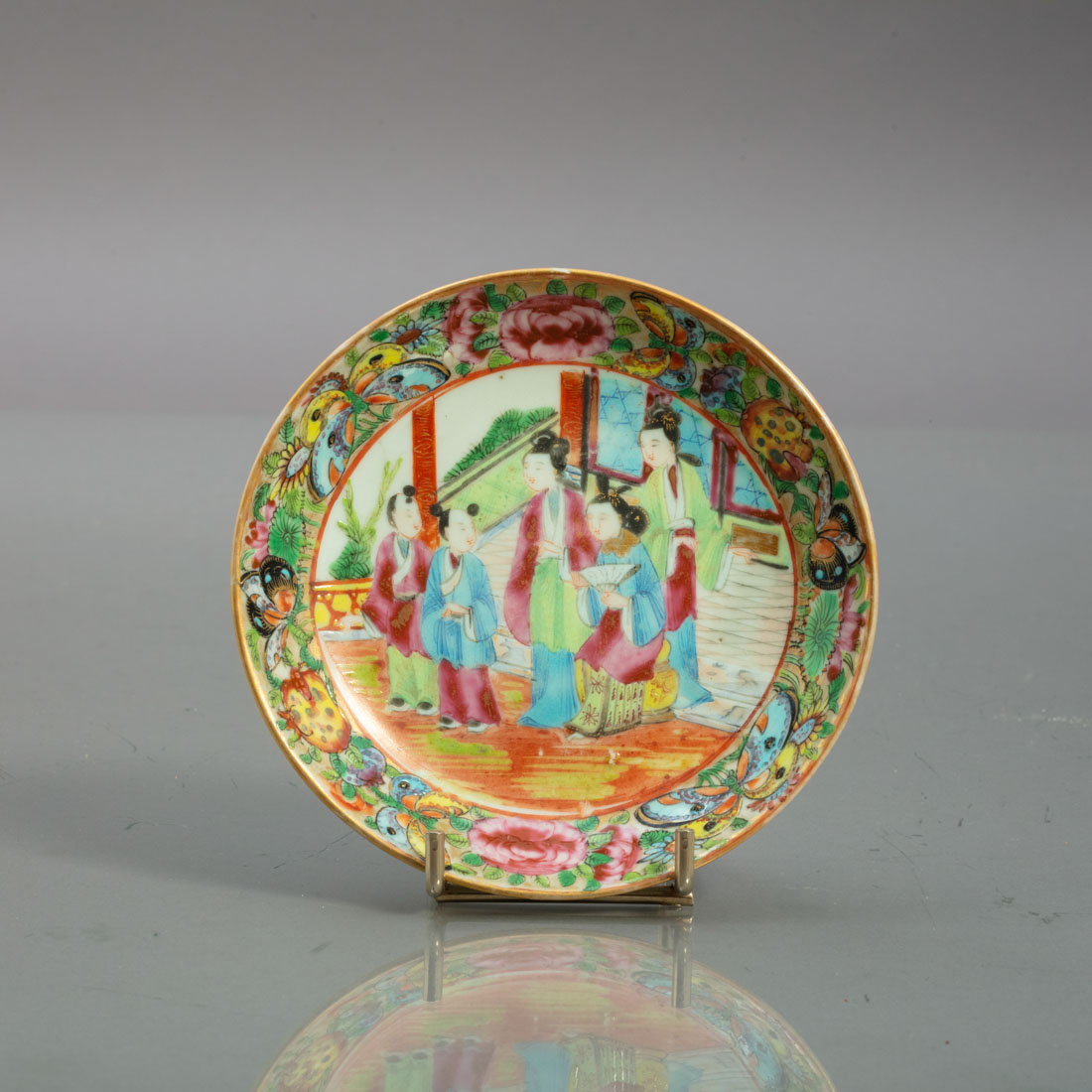 Em porcelana da China, Séc. XIX/XX, decoração "Mandarim" com esmaltes policromos e dourado, reserva com cena do quotidiano, flores e pássaros. Sinais de uso.