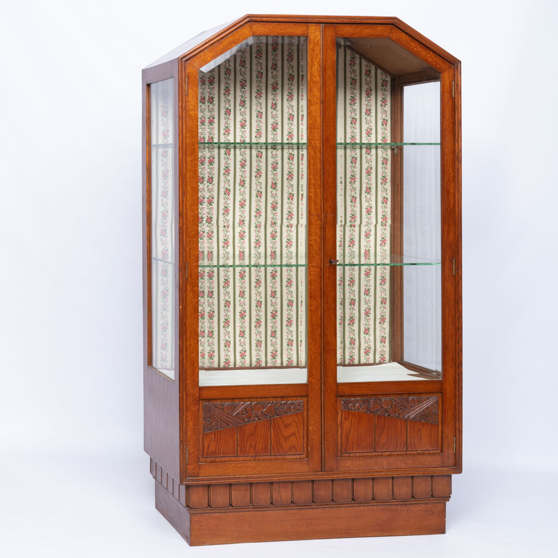 Em carvalho com entalhamentos, portas e laterais envidraçados. Pequenos defeitos.