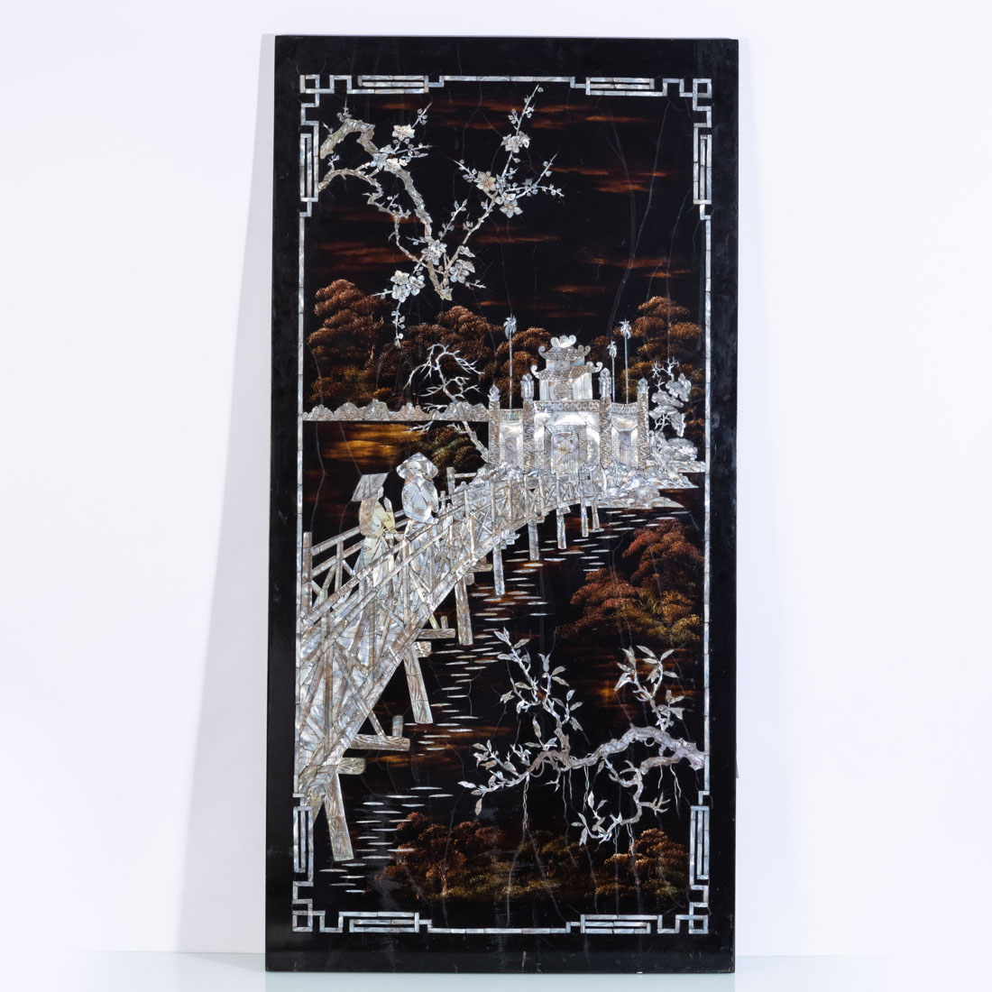 Em madeira lacada a negro com embutidos em madrepérola, "paisagem com pagode e figuras". China, Séc. XX. Pequenos defeitos.