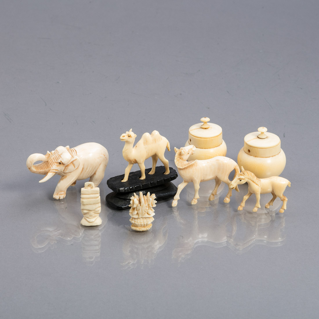Esculturas em osso esculpido. Composto dois potes, dois pendentes, dois cavalos, um elefante e um camelo. Camelo com base em madeira. Pequenas falhas.