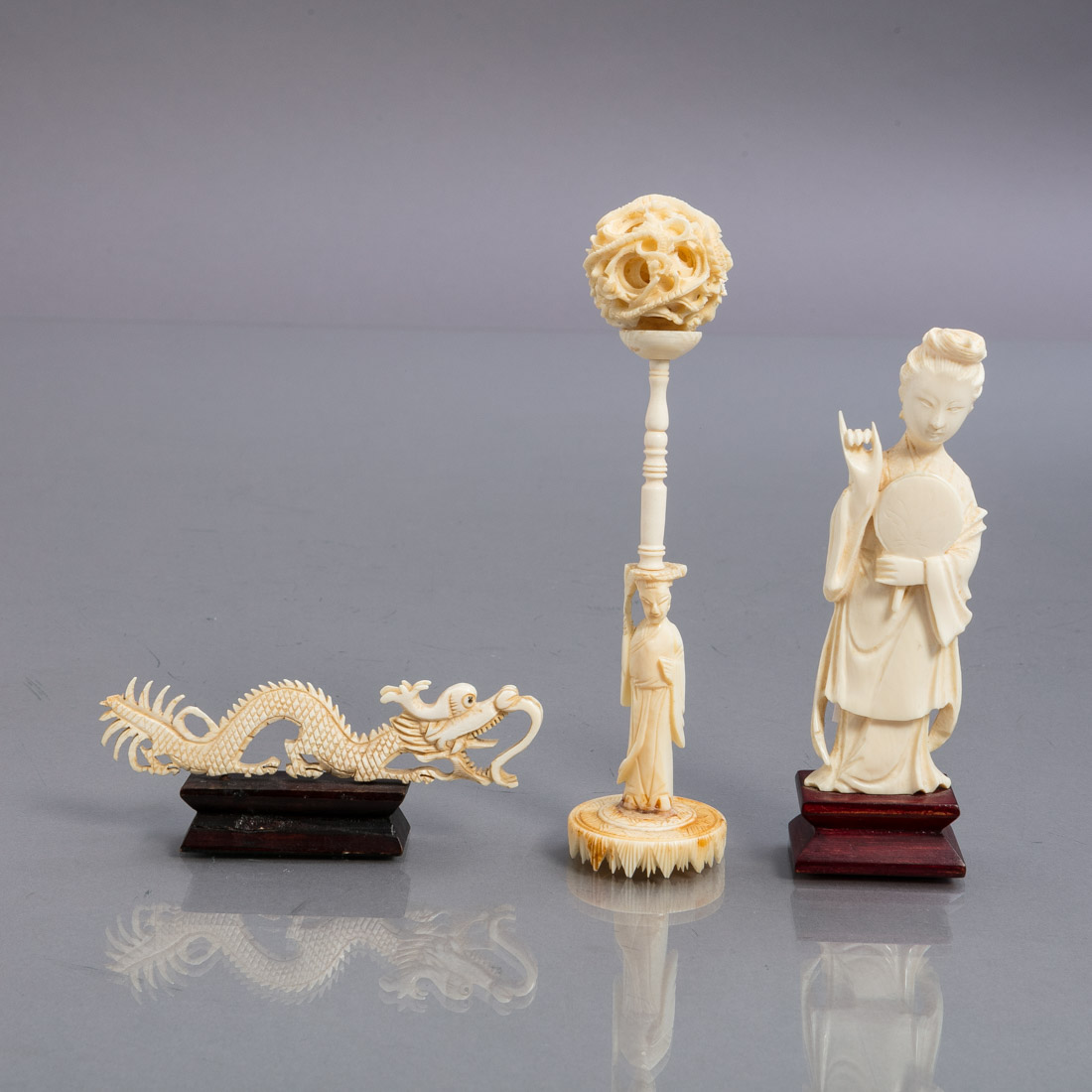 Esculturas em osso, China, Séc. XX. Duas com bases em madeira. Pequenas falhas.