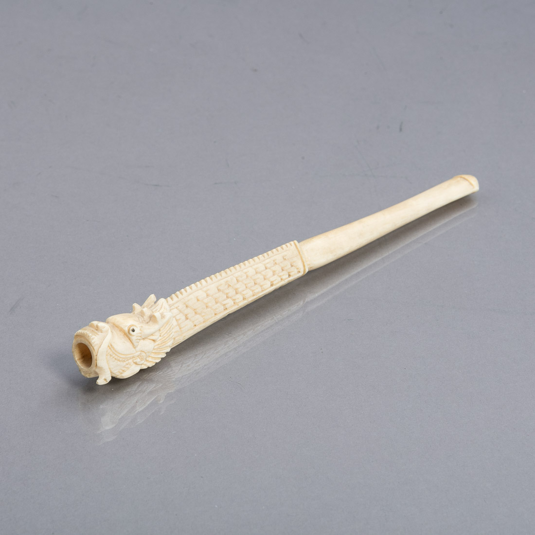 Esculpida em osso, decorada com dragão. China, Mingo. Pequena falha.