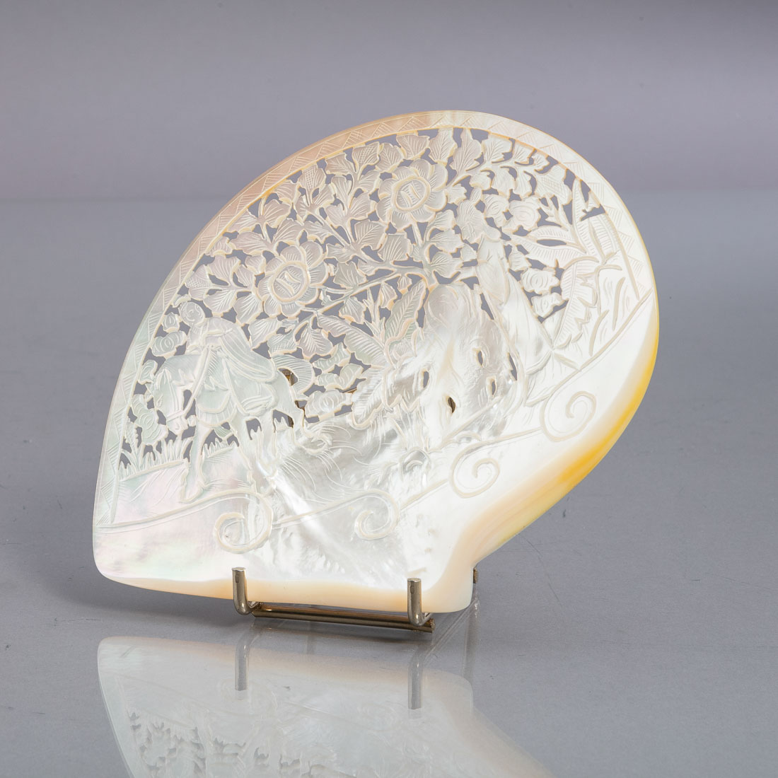 Em madrepérola esculpida e vazada "paisagem oriental com figuras". China Minguo (1912-1949). Sinais de uso.