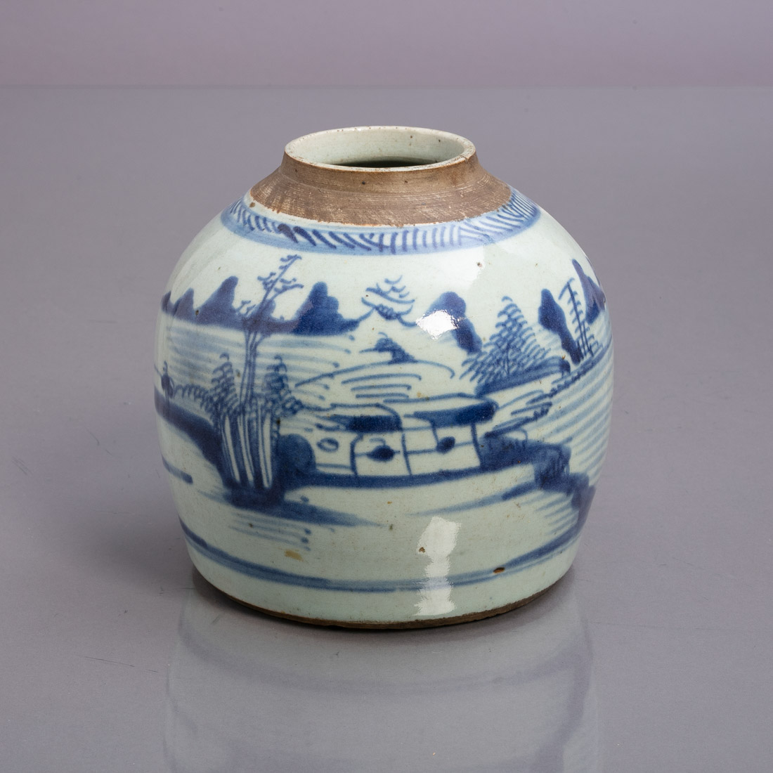 Em porcelana da China, decoração a azul com paisagem. Sinais de uso, pequenas esbeiçadelas no interior da base.