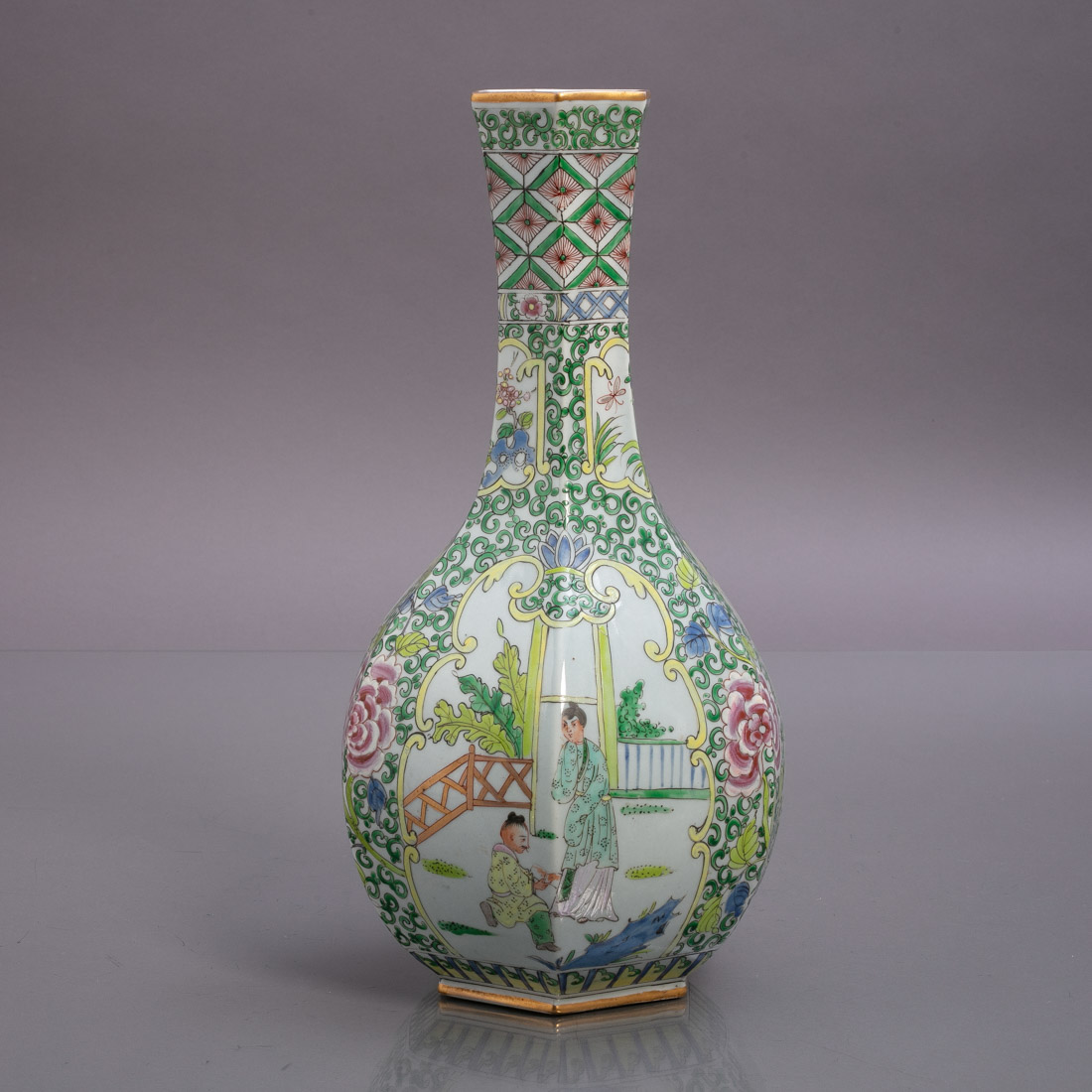 Em porcelana da China, decoração floral policromada, reservas com cenas do quotidiano. Marcada. Sinais de uso.
