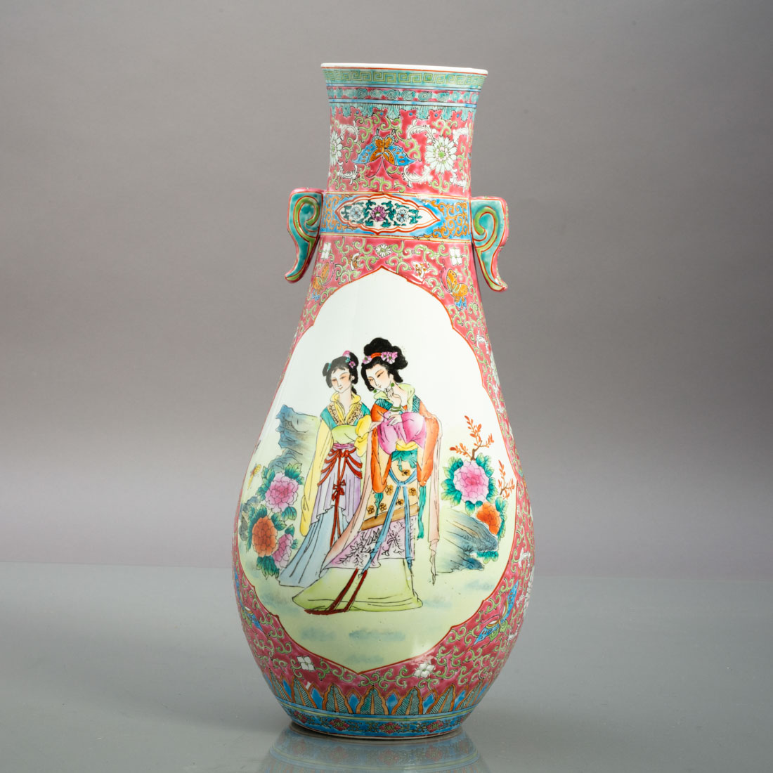 Em porcelana da China, decoração policromada flores e insectos, reservas "figuras femininas", pegas relevadas. Marcada. Sinais de uso.