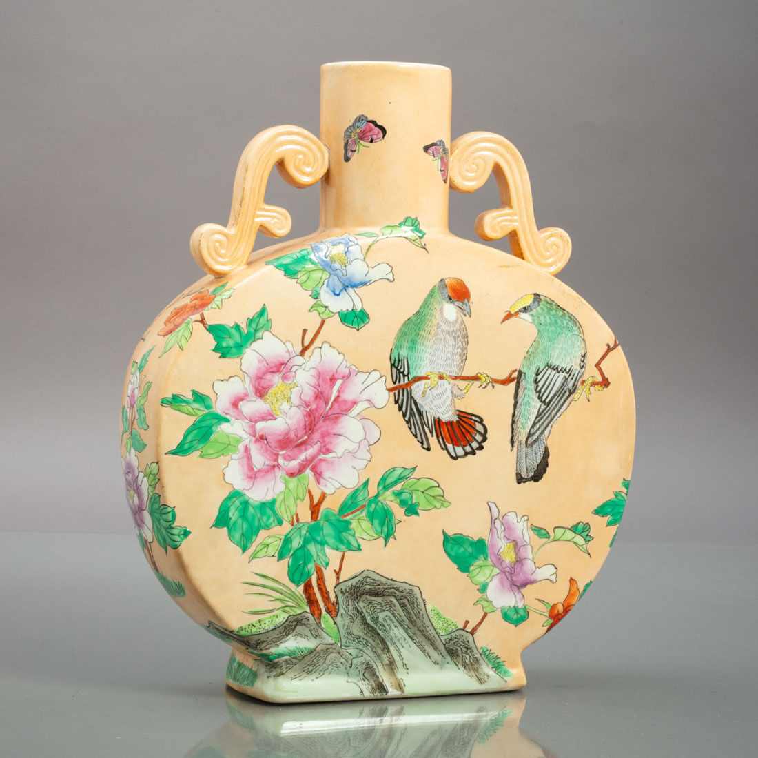 Em porcelana da China, decoração policromada "flores, pássaros e insectos". Sinais de uso.