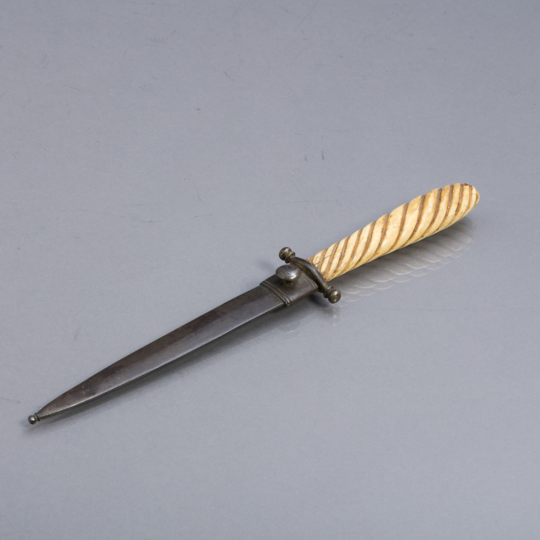 Europeu inicio Séc. XIX, com punho espiralado em matéria orgânica. Bainha em metal com guarda pequena "à quillon". Pequenos defeitos facilmente restauráveis.