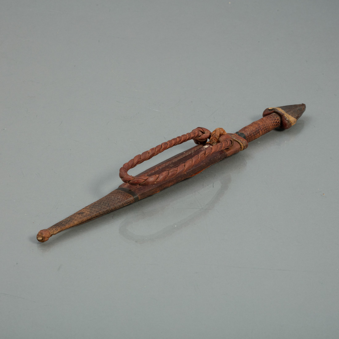 Ainda do Séc. XIX, transição da África Branca para a Negra. Lâmina lanceolada com motivos gravados. Bainha em couro prensado com partes de pele de jacaré e fiador de cinto. Punho também em couro com pomo bicudo em ferro para fender crânios. Interessante epouco vista. Muito bom estado a necessitar de ser encerada Comp. 35 cm.