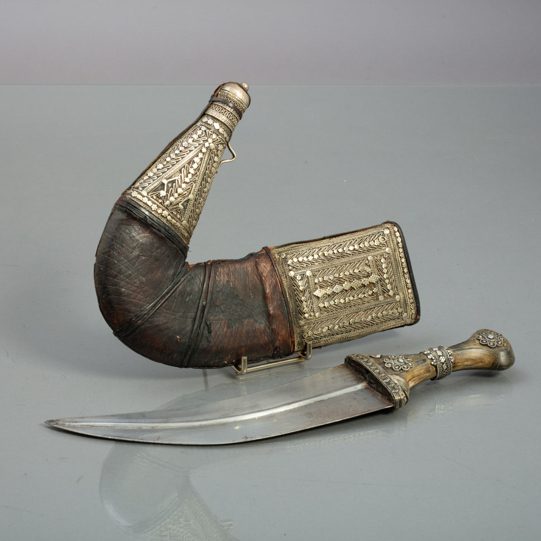 Lâmina curva com aresta centra, Séc XIX. Punho em matéria córnea com aplicações de metal prateado. Bainha em couro com a ponta e o bocal em prata baixa com motivos otomanos que aparecem de Argel a Viena. Faltas e defeitos, que desaparecerão com um poucode cera. Comp da lâmina 22 cm.