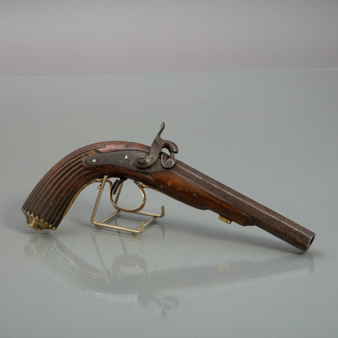 Meados do Séc. XIX. Coronha de nogueira em "Half Stock", punho de caninhas, no estilo D. MARIA ll rematado com uma calote de metal. Guarda mato inteiriço, mal soldado, fecho de percussão tipo "back action", que provavelmente não tem mecanismo, nitidamentepregado (no verdadeiro sentido da palavra) à madeira. Robusto cano oitavado com calibre de mosquete Falta da vareta e defeitos menores. Está descarregada. Decorativa. Comp. 32 cm.