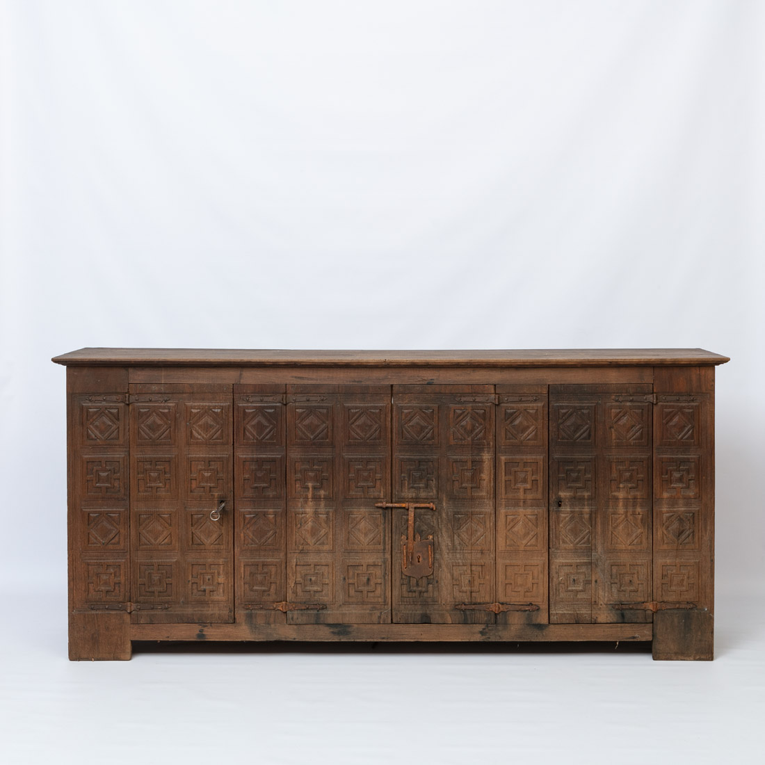 Ao gosto espanhol, em castanho com entalhamentos, de quatro portas, ferragens em ferro. Falhas e defeitos.