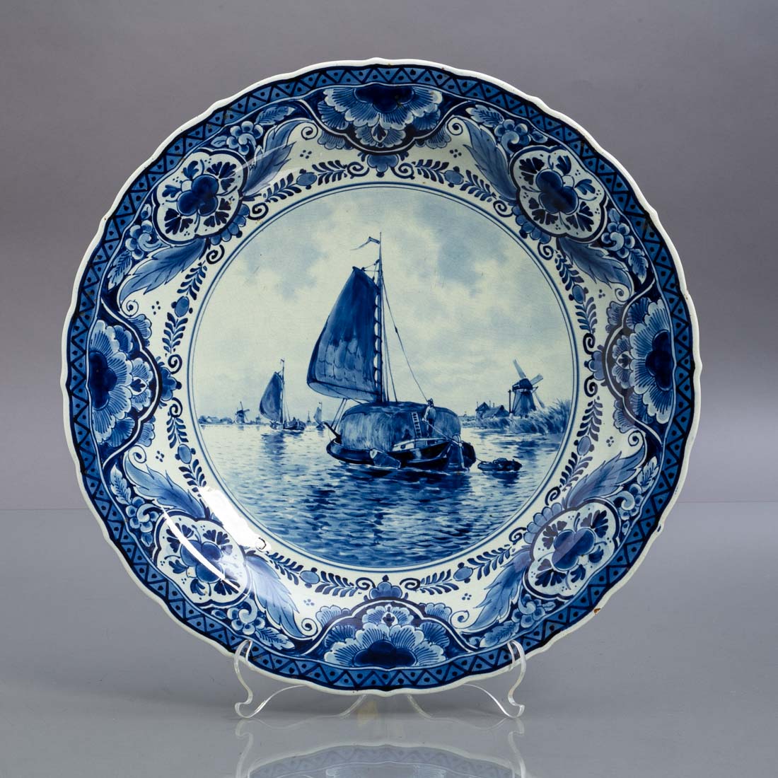 Em faiança de Delft, decoração a azul com paisagem com barcos e moinhos, na aba elementos vegetalistas. Holandesa, Séc. XX. Ligeira esbeiçadela, cabelo e craquelé.