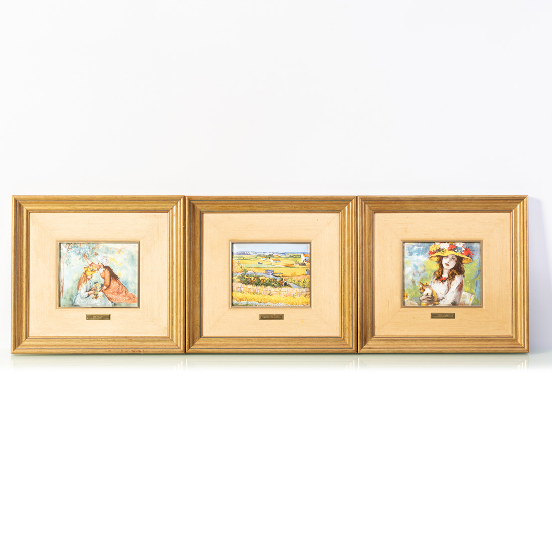 "Jovens colhendo flores", "Menina com chapéu" e "Colheita na Crau (O carro azul)". Três placas em esmalte decoração policroma, ao gosto de Limoges. Reproduções. Emolduradas.