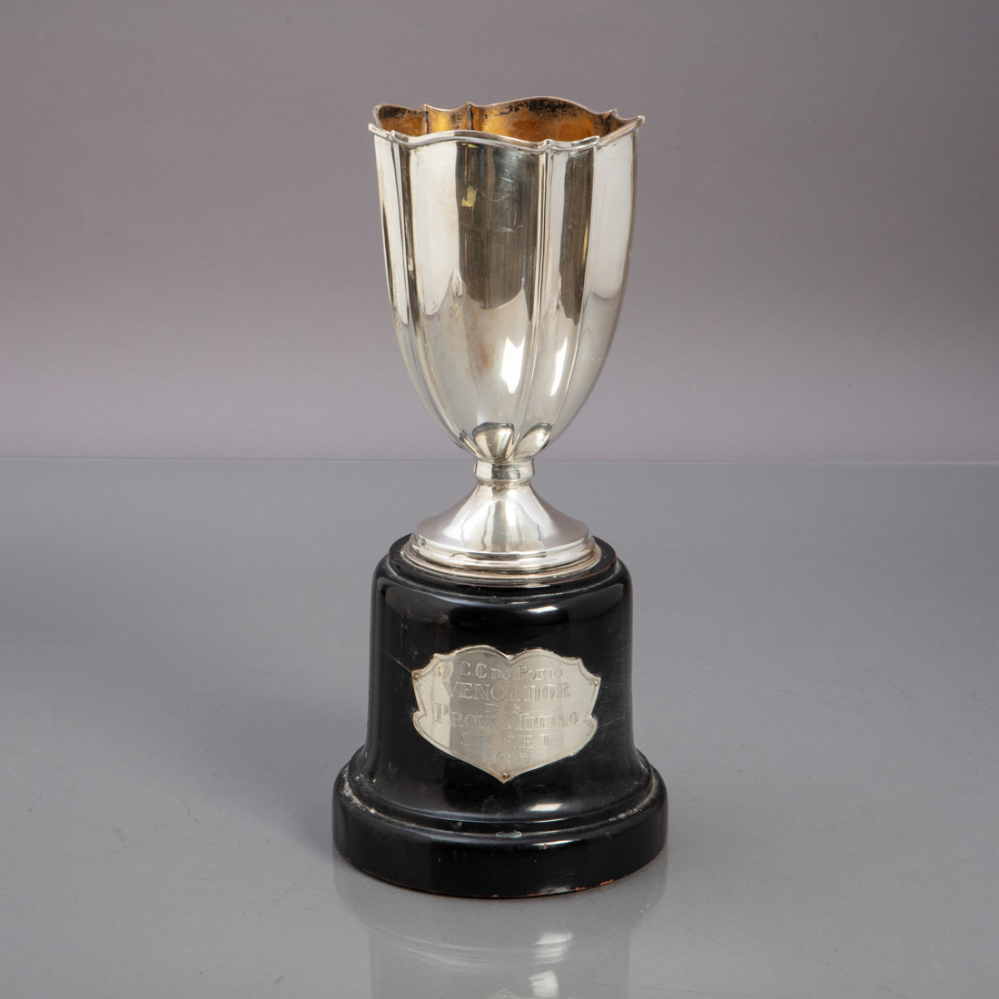 Em prata portuguesa decoração gomada, base em madeira com placa em prata contraste águia (1938-1984) de 833, com inscrição gravada "C.C. do Porto-Vencedor das Provas Treino Skeet-1955". Base em madeira. Sinais de uso. P Aprox.Taça: 310gr. Dim.Total: 34 cm