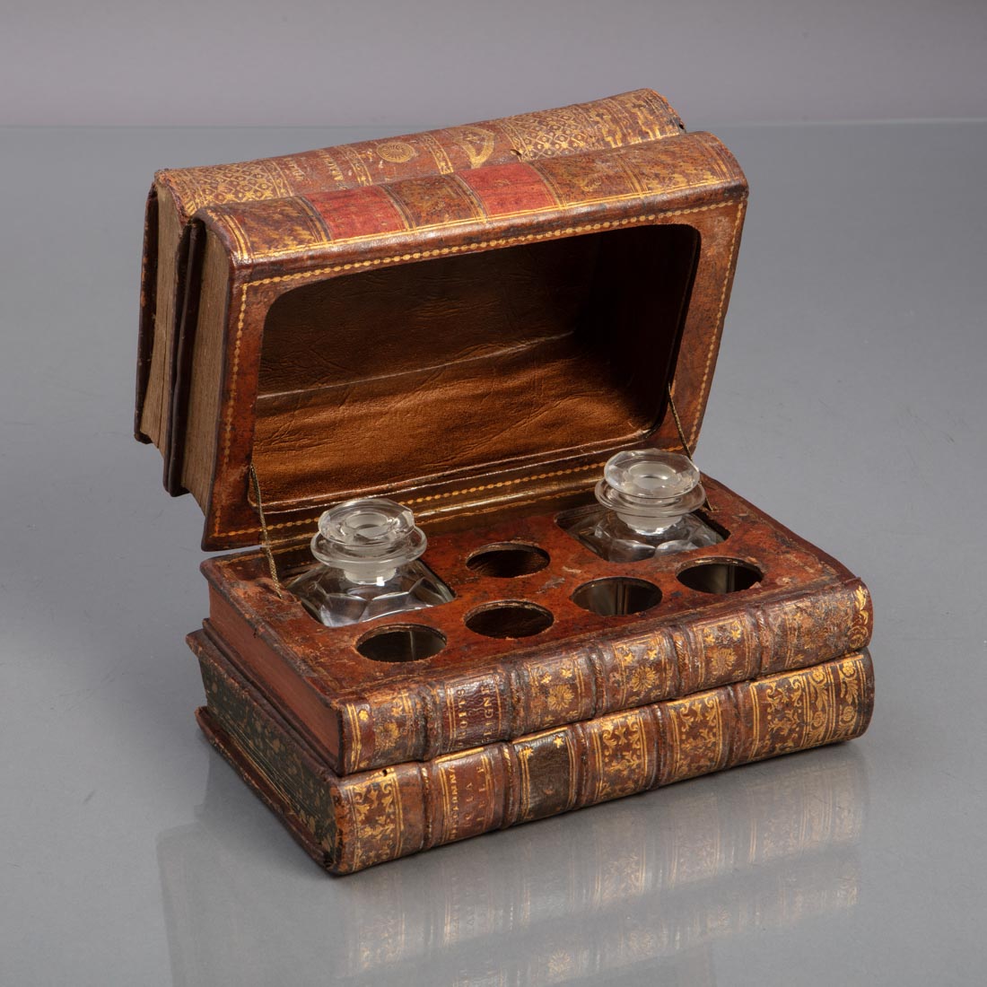 Em madeira forrada a couro com ferros dourados e outros materiais, no interior dois frasco em vidro. Francesa, Séc. XX. Pequenos defeitos.