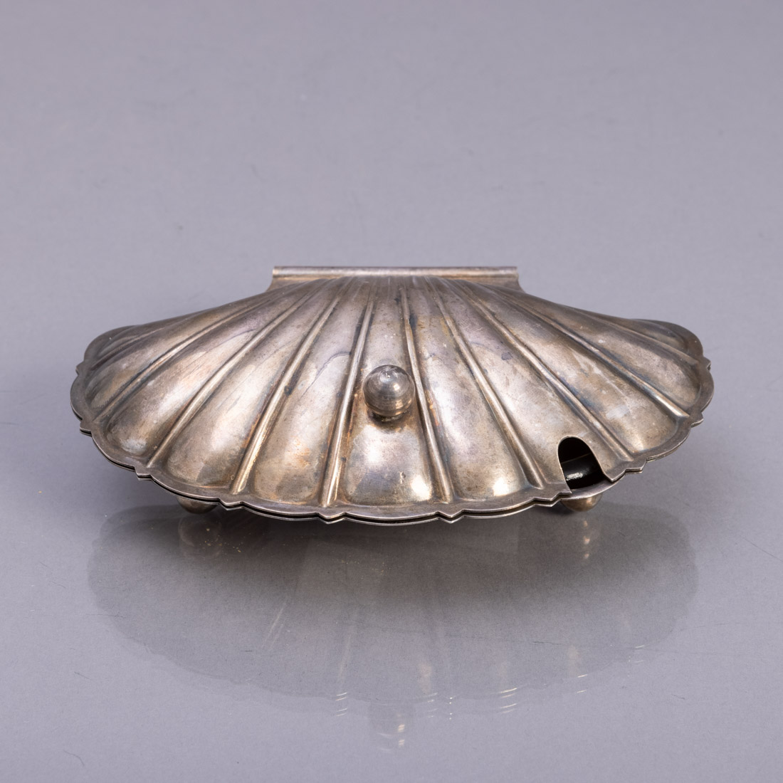 Em metal prateado, decoração relevada, alma em vidro. Sinais de uso.
