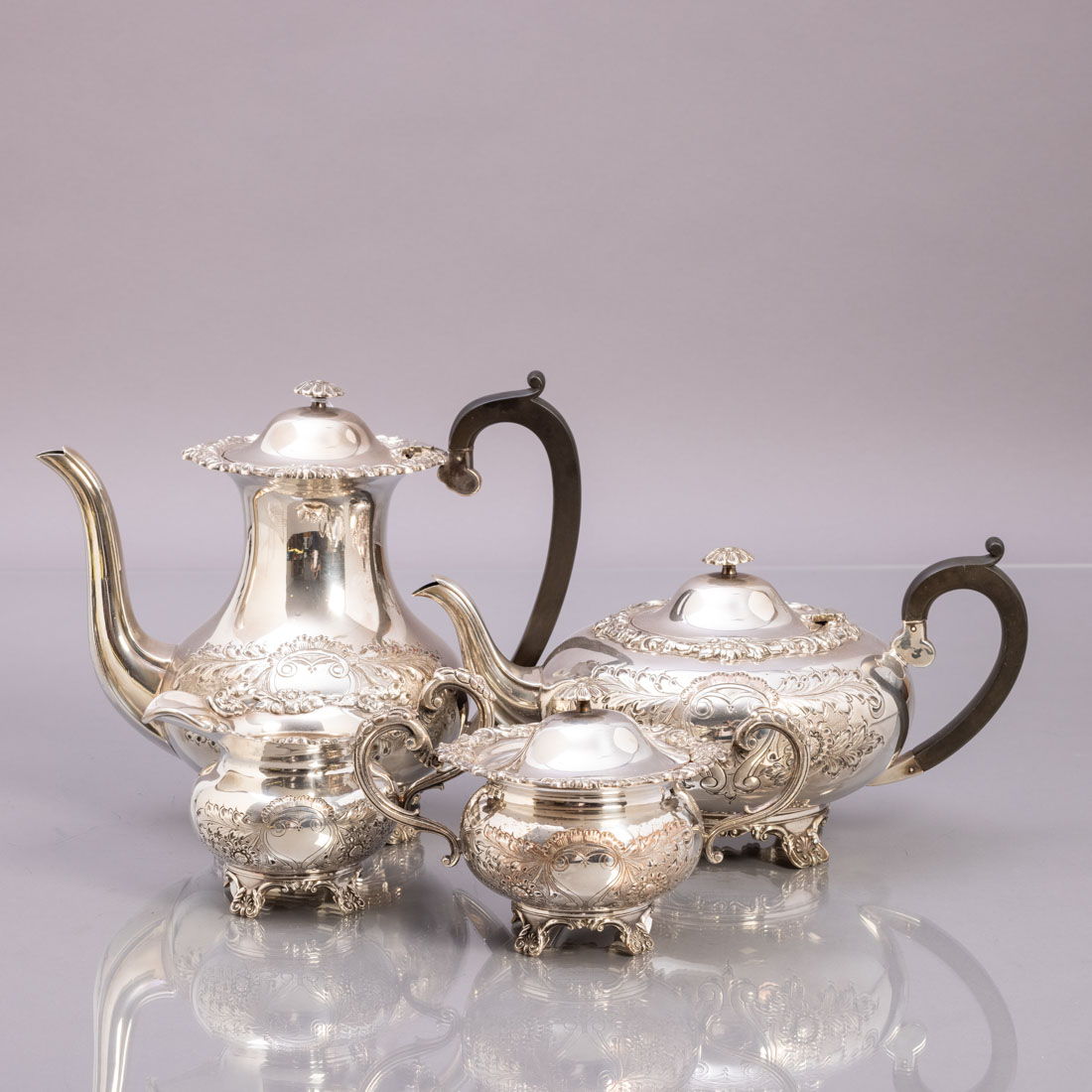 Em metal prateado, decoração relevada "flores". Composto por bule, cafeteira, leiteira e açucareiro. Inglês. Séc. XX. Sinais de uso.