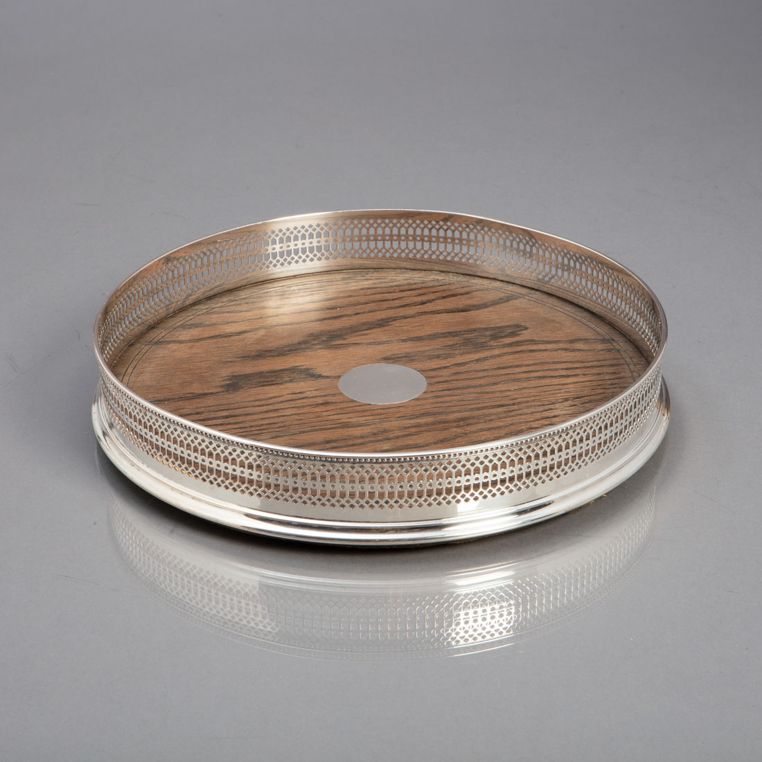 Em metal prateado, gradinha vazada, base folheada a madeira exótica. Sinais de uso, pequenos defeitos na folha.