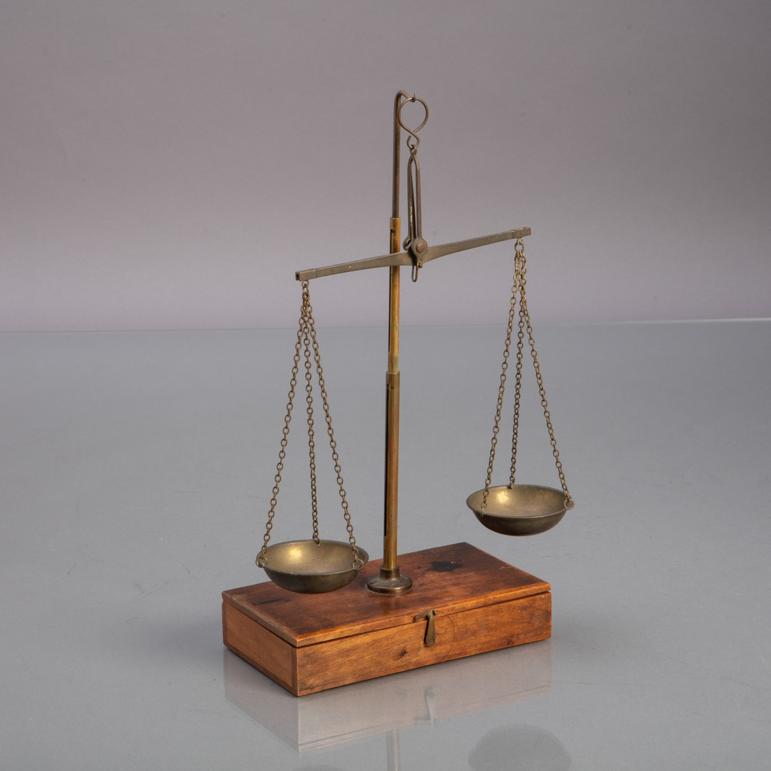 Em metal amarelo, caixa original de transporte em madeira, colunas de suporte, balança de dois pratos, acompanha quatro pesos. Séc. XIX/XX. Sinais de uso.